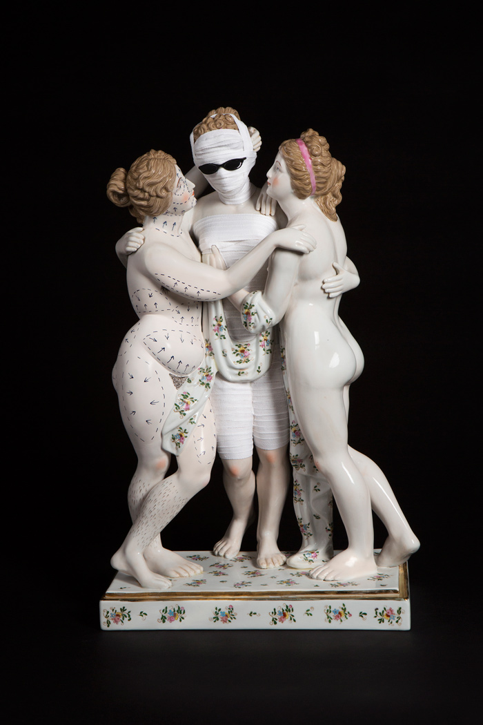 Penny Byrne, Keep Young and Beautiful if you want to be Loved 2011, Vintage porcelain figurines, Epoxy putty, cotton tape, vintage Barbie doll sun glasses, enamel paints, blue and black Sharpie texta